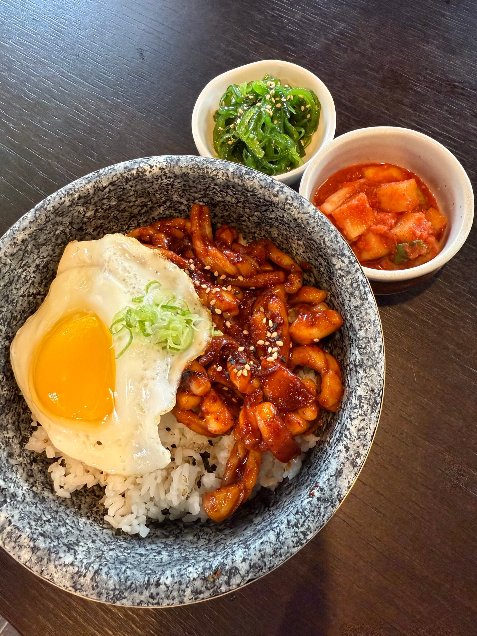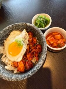 diced chicken katsu, spring mix, seaweed salad, purple lettuce, avocado, corn, edamame, fried onion with pearl special sauce(sesame used)