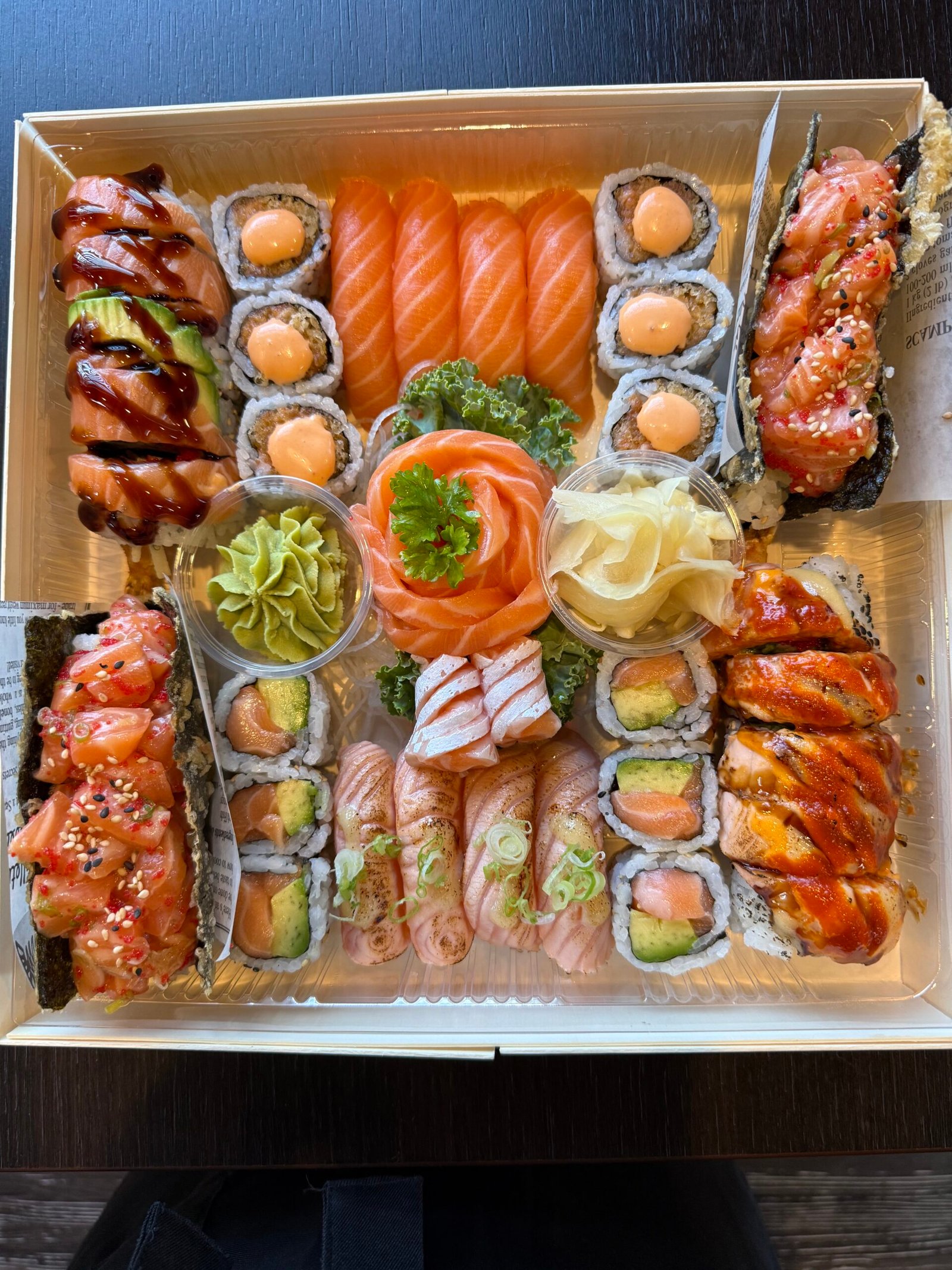 All salmon sushi (12pcs), all salmon sashimi (16pcs) &  rolls(14pcs)